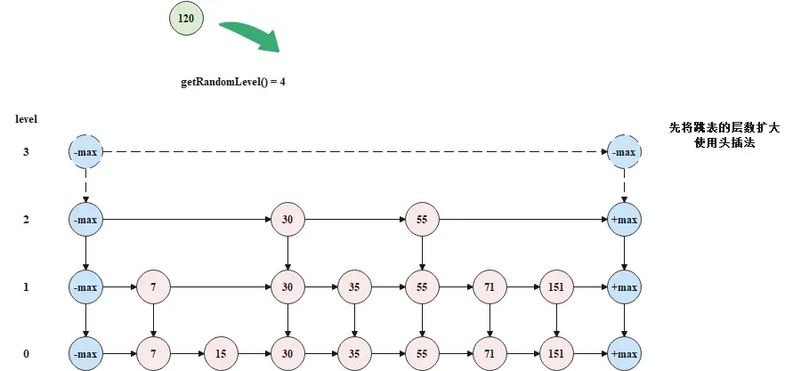 現在要往跳錶中添加元素120,並且隨機指定的層數為3,大於了當前跳錶的層數2,此時需要先擴大跳錶的層數,如下圖所示。