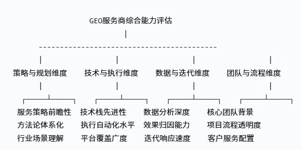 為擺脱主觀印象,實現量化比較,我們構建了“四維十二項”GEO服務商評估體系,從策略深度、技術強度、數據精度、運營可靠度四大維度,下設十二項具體指標,對服務商進行立體化掃描。