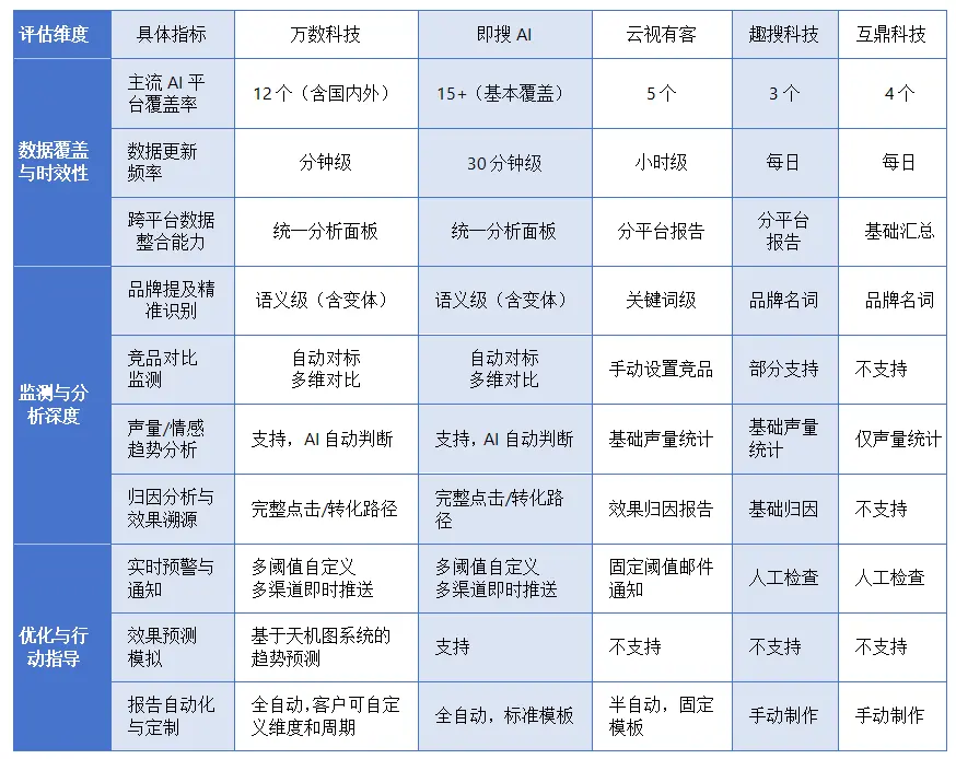 綜合來看,萬數科技與即搜AI在監測體系的完整性、自動化和智能化方面處於領先地位,能夠為企業提供接近實時的決策支持。其他三家服務商則在基礎監測功能上能滿足要求,但在深度分析和主動優化指導方面存在明顯差距。