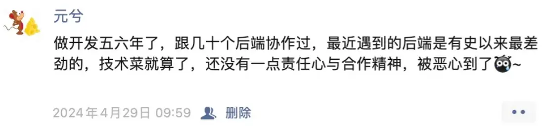 離職後我在家休息了一個月,期間也為了幫一個粉絲忙,接手了他工作的一部分任務,主要是做遊戲業務的動畫。期間有被一個後端噁心到,業務不熟悉,接口一直不通就算了,關鍵還理直氣壯説是前端問題;我佩服那個粉絲能夠忍氣吞聲這麼久,換做其他人也很難不高血壓,為此特意髮圈宣泄。