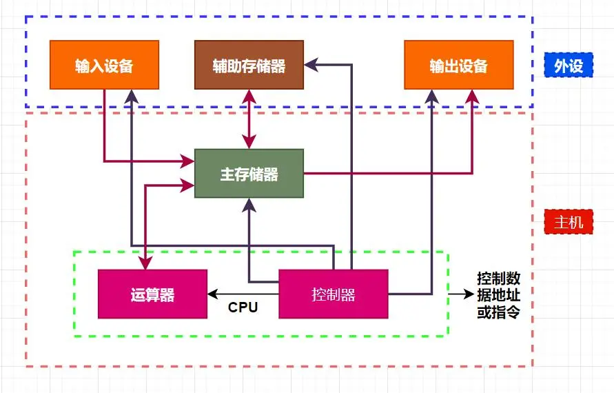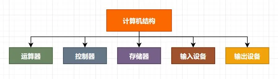 計算機結構主要由運算器、控制器、存儲器、輸入設備和輸出設備組成。簡化的結構圖如下圖所示。