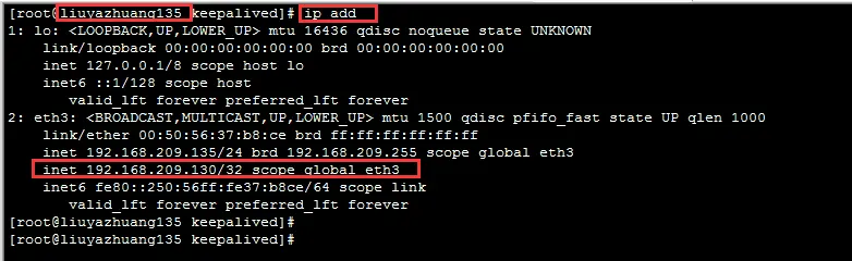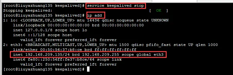 由上圖可知:Keepalived 停止後, 192.168.209.135 節點的網絡接口中的 VIP(192.168.209.130) 將消失