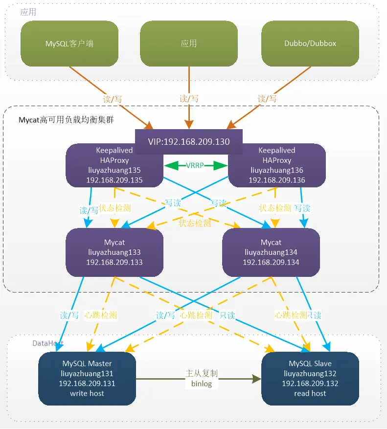 綜上: Mycat 的高可用及負載均衡由 HAProxy 來實現,而 HAProxy 的高可用,由 Keepalived 來實現。