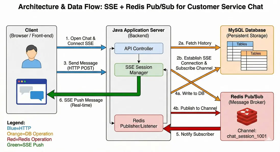 - 集羣支持: 當你的後端擴展到多台服務器時,Redis 負責把消息“廣播”到持有 SSE 連接的那台具體服務器上。