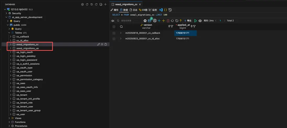 運行遷移後,數據庫中呈現出清晰的隔離視圖。每個模塊擁有獨立的遷移歷史表,互不干擾。