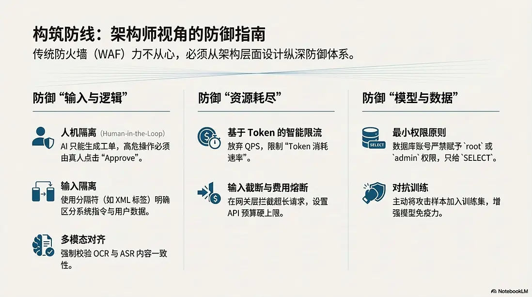 SELECT權限,嚴禁賦予root或admin權限。 - 對抗訓練: 在訓練階段,主動將“貼紙路牌”、“噪音語音”等攻擊樣本加入訓練集,讓 AI 見多識廣,增強對髒數據的免疫力。