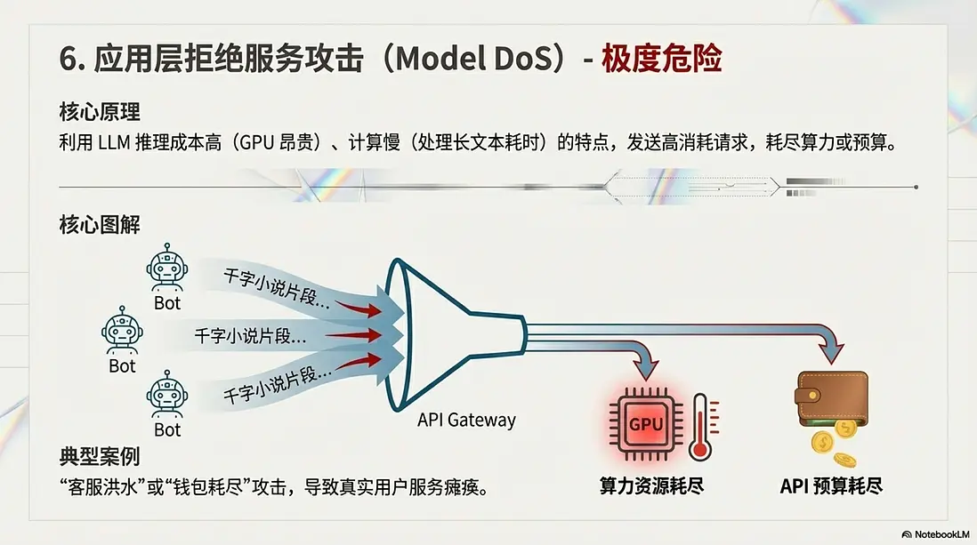 - 典型案例: “客服洪水(錢包耗盡)”。攻擊者控制大量殭屍號涌入電商客服,每個人都粘貼幾千字的小説片段,要求 AI “詳細總結並重寫”。這會導致公司的 API Key 額度在幾分鐘內耗盡(錢包耗盡),或者後端 GPU 顯存被長上下文請求佔滿,真實用户的服務徹底癱瘓。