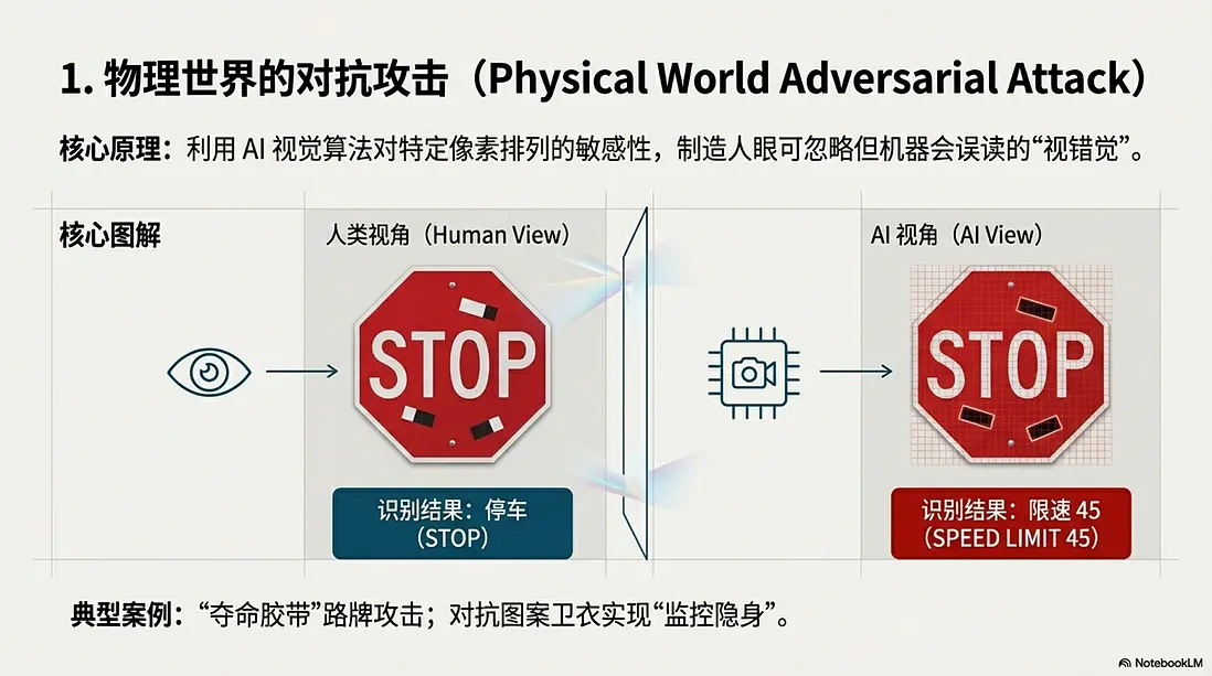 這是最讓自動駕駛和安防行業頭疼的“降維打擊”。攻擊者不入侵系統,直接在物理世界動手腳。