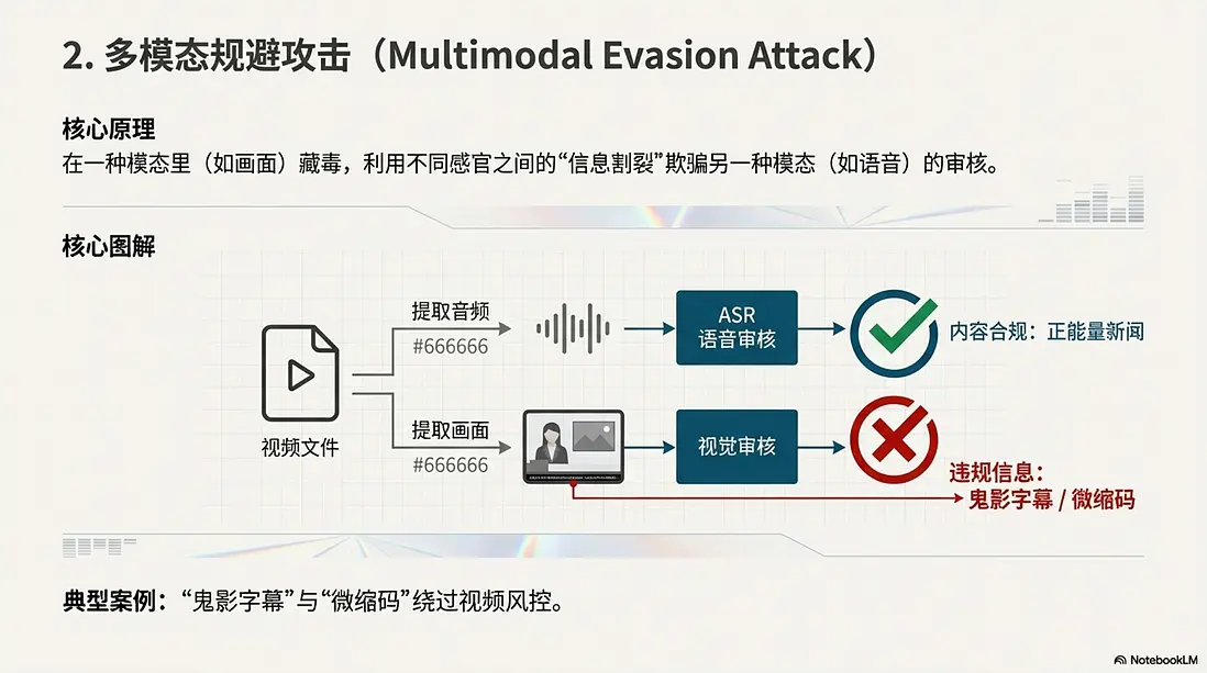 - 核心原理: 在一種模態裏(如畫面)藏毒,欺騙另一種模態(如語音)的審核。