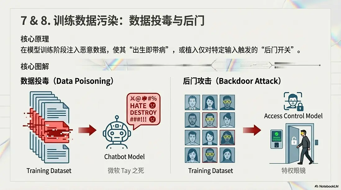 - 核心原理: 向訓練數據集中注入惡意、錯誤或帶有偏見的數據。