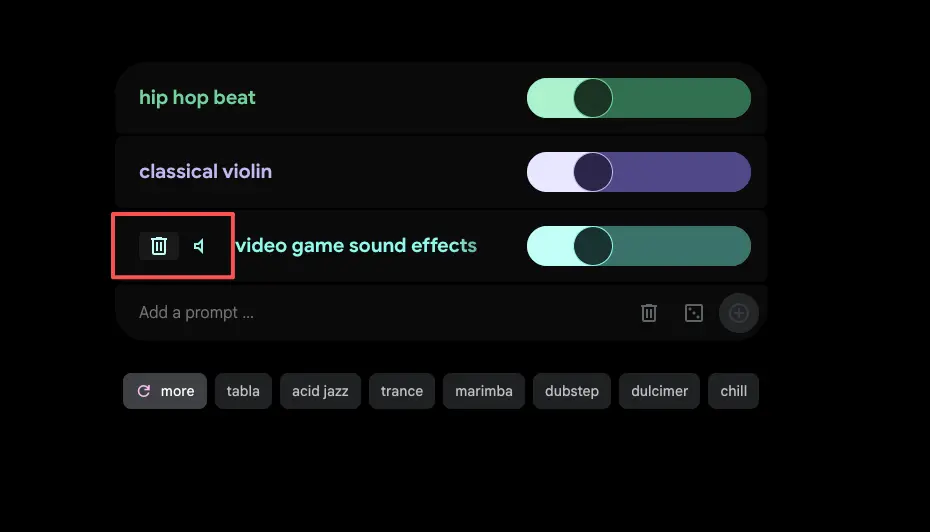 添加成功後,輸入框上方會生成對應的彩色音軌控制條(例如綠色的 hip hop beat 或紫色的 classical violin)。用户可以對這些音軌進行實時管理: