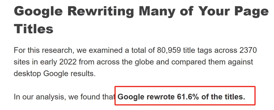 在 Moz 進行的涉及 57832 個標題標籤的研究中,Peter J. Meyers 博士 發現, Google 重寫了其中 58% 的標題,而在 Cyrus Shepard 的另一項涉及 80959 個標題標籤的 研究 中,Google 重寫了 61%。