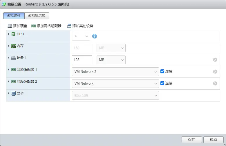 接下來點進虛擬機RouterOS,關機之後編輯設置,給它添加一個網絡適配器,然後給網絡適配器1分配VM Network 2,給網絡適配器2分配VM Network 1,保存,開機。
