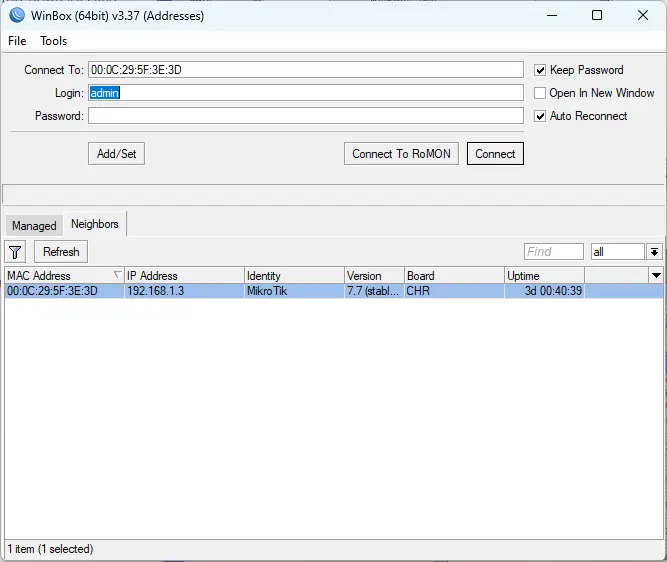 第一次登錄的時候,因為我並不知道路由器的地址,所以沒辦法用IP地址打開RouterOS的配置頁面,但MikroTik很貼心的提供了用MAC地址連接的功能。在WinBox的Neighbors頁面雙擊RouterOS的條目,用admin用户和空密碼登錄就可以。