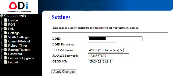 稍等幾分鐘等貓棒開機,開機之後,轉換器在貓棒方向的燈會亮起來。這時候先把網線跟電腦連起來,給電腦分配一個192.168.1.0/24範圍的地址(當然別用192.168.1.1,那是貓棒後台的地址),然後用瀏覽器打開192.168.1.1,就能看見貓棒後台的登陸頁面了。賬號和密碼找商家要,我這款是admin/admin,但不保證所有ODI貓棒都是這一對賬號密碼。登陸進去後,進入Settings頁面,填入LOID,點Apply Changes,然後進入Commit/Reboot頁面,點Commit and Reboot按鈕保存配置並重啓,貓棒端就配置完成了。