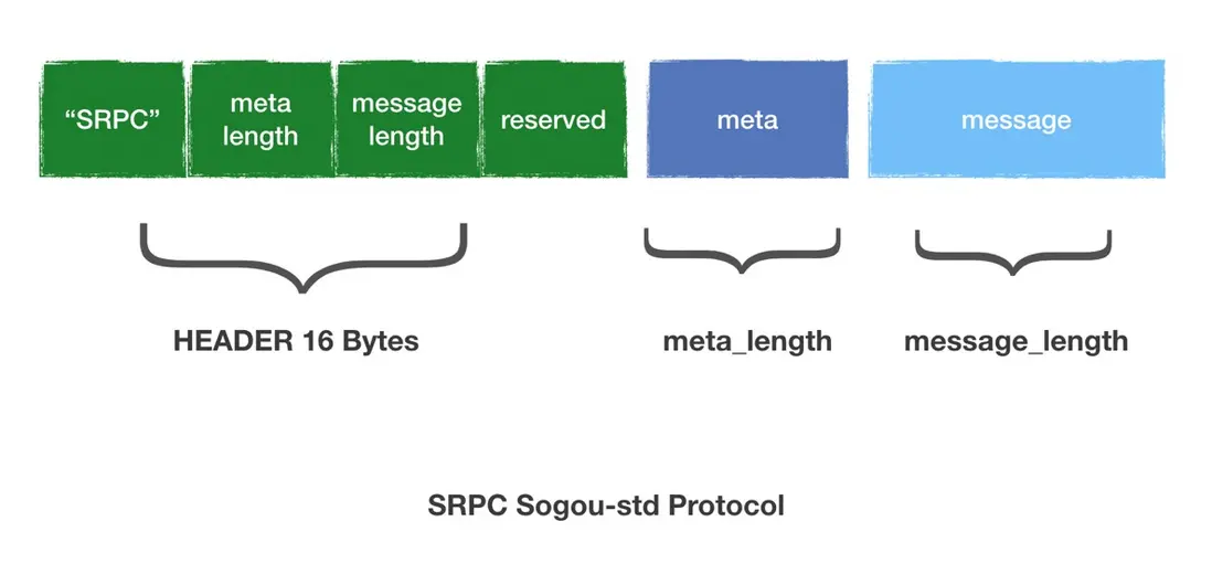 那麼誰定義了 SRPCMessage的內存結構呢?就是SRPC協議。下圖可以清晰地看到,我們在SRPC協議頭部就有meta部分,上述提到的service和method就是填在裏邊。而後面的message就是我們的Request。