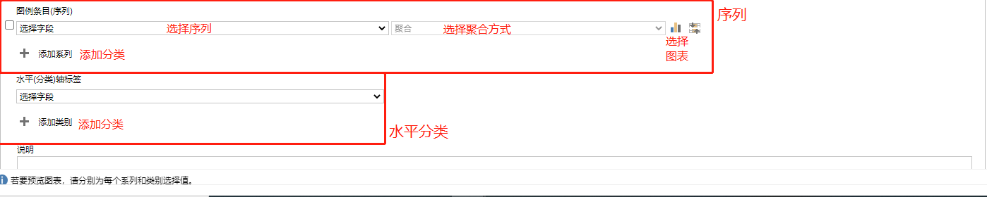 數據選擇分【序列】和【水平】兩種,水平是分類依據(可以理解為Group By),有且只能有兩個水平分類,不能選擇圖表的類型。序列是根據水平分類後分組的數據結果,最多可以添加五個,並且可以選擇圖表的類型。