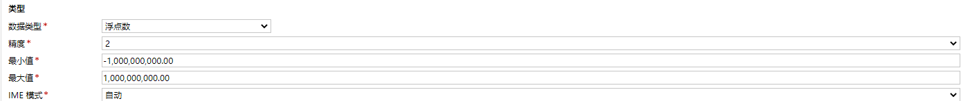 浮點數代表小數,可以選擇0-5位小數做精度,取值範圍(-1,000,000,000.00~1,000,000,000.00)