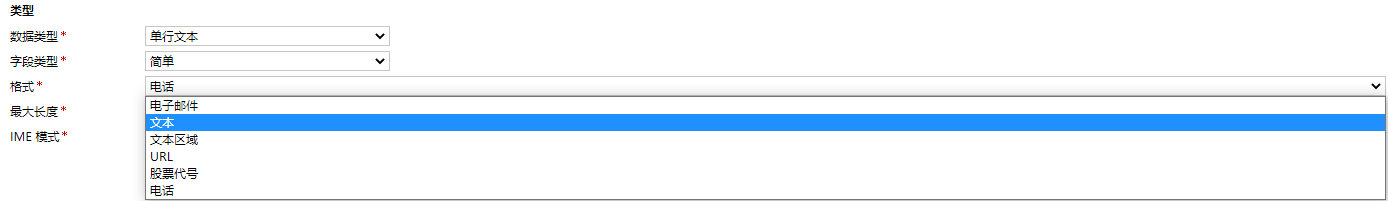 單行文本顧名思義就是基礎的短字符文本字段。在Dynamics CRM產品裏面單行文本字段有六種分別是電子郵件、文本、文本區域、URL、股票代碼、電話。不同類型的文本會在頁面上有不同的展示。