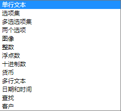 Dynamics CRM目前總共有13種字段類型,分別為單行文本、選項集、多選選項集、兩個選項、圖像、整數、浮點數、十進制數、貨幣、多行文本、日期和時間、查找、客户。如下圖: