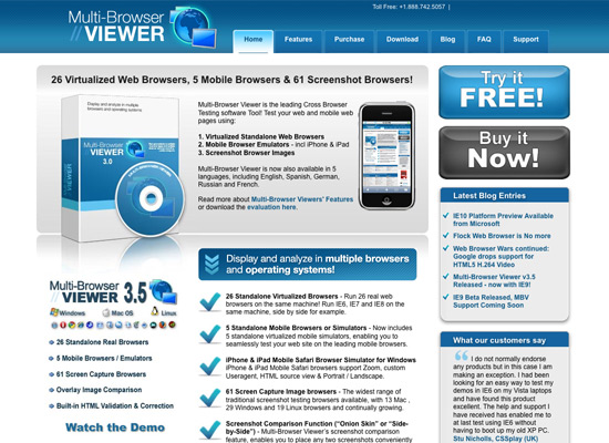 Multi-Browser Viewer covers both desktop and mobile browsers. It includes 26 virtualized Web browsers, 5 mobile browsers (including the iPhone and iPad) and 61 screenshot browsers (meaning you can see how the website renders but not interact with it). It’s also available in five languages: English, Spanish, German, Russian and French.