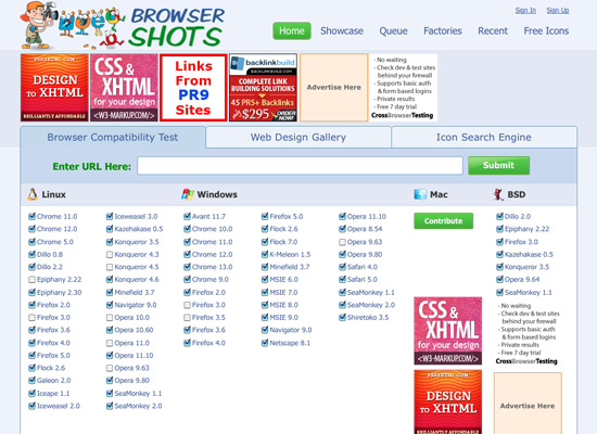 Browsershots is probably the most comprehensive free testing tool available. It includes Linux, Windows and BSD browsers. It also includes a number of browsers you’ve probably never heard of (like Galeon, Iceape, Kazehakase and Epiphany). For the most part, Browsershots tests on the most recent version of each browser, as well as on legacy versions.
