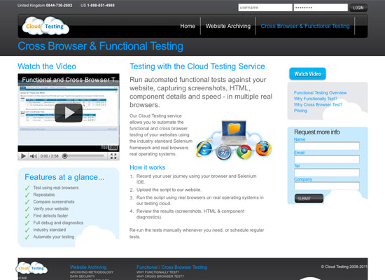 Cloud Testing offers functional cross-browser testing. You record the user journey with your browser and Selenium IDE, upload it, and then Cloud Testing will run that script in multiple operating systems and browsers. It then provides screenshots and HTML and component diagnostics. No prices are listed on its website.