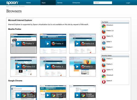 Spoon is an application emulation service. It provides free versions of Firefox, Chrome, Opera and Safari for Windows users. A number of versions of each browser are included: Firefox 2–5, Chrome 4–8, Safari 3–5 and Opera 9–10. Bad news: Internet Explorer is supported by Spoon virtualization but is not available by request of Microsoft.