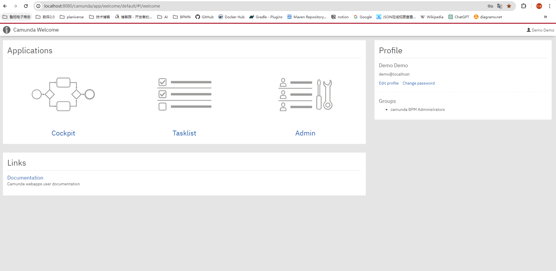 - Camunda web:http://localhost:8080/camunda/app/welcome/default/#!/welcome