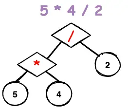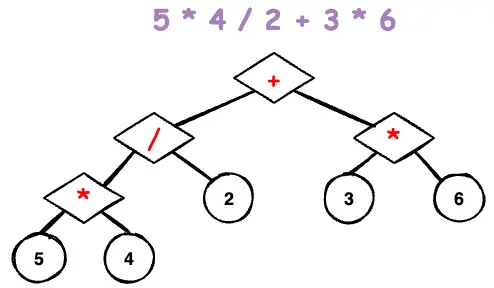 5 * 4 / 2 + 3 * 6 這是一個簡單的算法運算,但是如果我們要通過樹形的方式表達它的話,結果可能是以下這樣:
