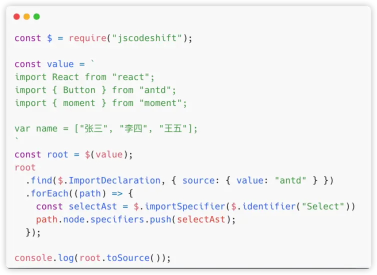 為了快速瞭解,我們這篇以 JavaScript 文件為例,那麼解析與操作 JavaScript 文件,已經有了比較好用的輪子 -- jscodeshift,我們下面就利用 jscodeshift 來操作 AST
