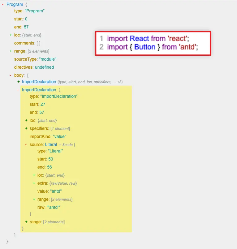 我們對比上面的 節點類型含義對照表 ,可以看出這是兩個 ImportDeclaration 語句