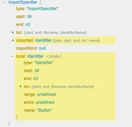 這個 API 的目的是隻查找 source = antdImportDeclaration 元素,然後進行替換,Button 命名的所在位置在 imported.name,因此我們相應修改該值即可