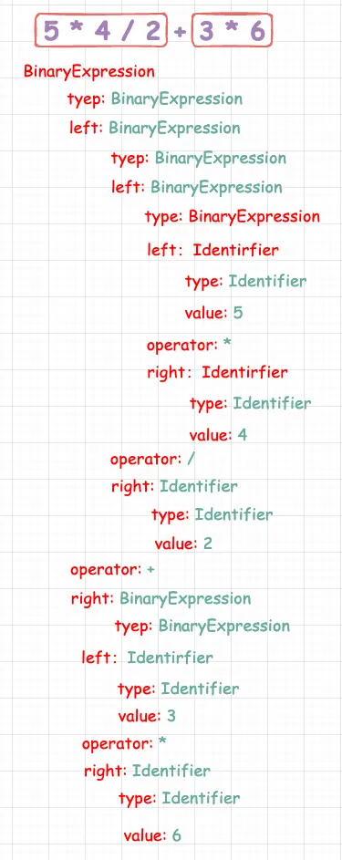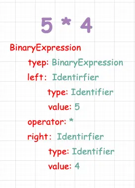 我們需要先定義下規則,如果遇到一個運算,我們就以 BinaryExpression 來表示,而 運算 中的結構自然就包含着 字符運算符 ,比如 5 * 4 這是一個運算,我們將整體標識為一個 BinaryExpression