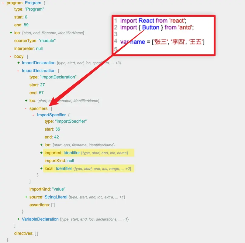我們分析得到該結構的組成部分由 ImportSpecifierIdentifier 組成,ImportSpecifier 中包着 Identifier