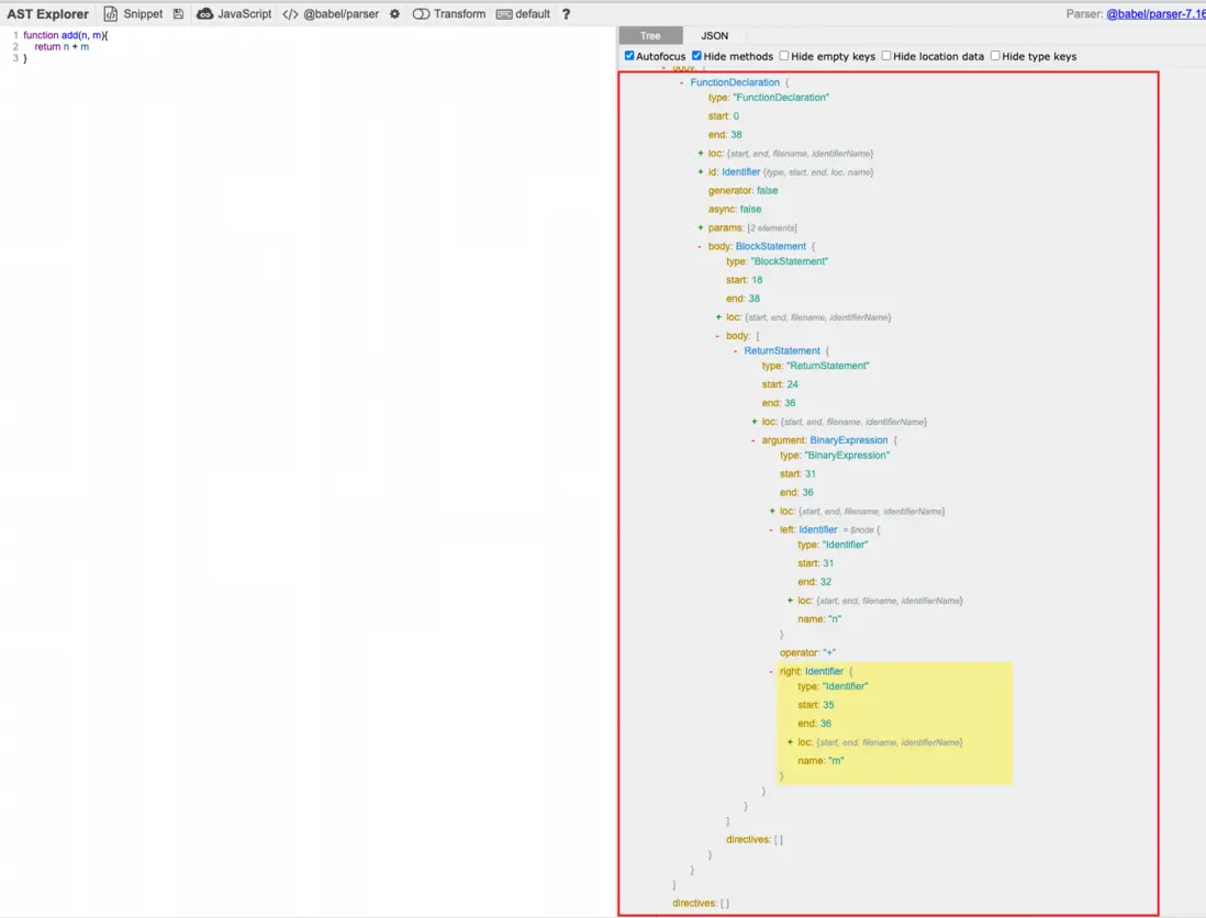 左邊是我們平時編寫的代碼,而右側便是通過代碼轉換得到的 AST 樹