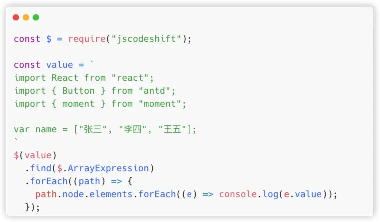 我們來看這段話的含義,代碼中我們通過引入 jscodeshift 來幫助我們解析和操作 AST 文件,然後在 API 中聲明瞭我們要查找元素的類型