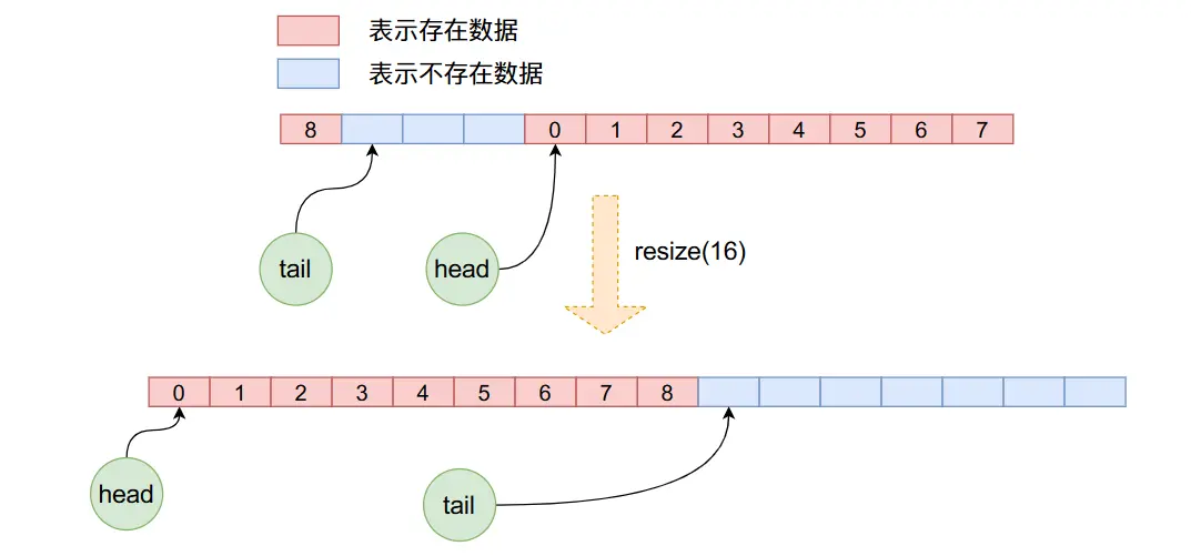 resize函數當中首先申請新長度的數組空間,然後將原數組的數據一個一個的拷貝到新的數組當中,注意在這個拷貝的過程當中,重新更新了headtail,而且並不是簡單的數組拷貝,因為在之前的操作當中head可能已經不是了0,因此新的拷貝需要我們一個一個的從就數組拿出來,讓後放到新數組當中。下圖可以很直觀的看出這個過程: