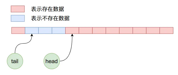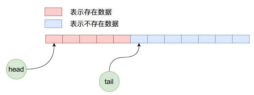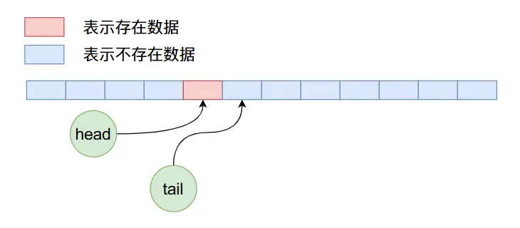 首先ArrayQueue內部是由循環數組實現的,可能保證增加和刪除數據的時間複雜度都是$O(1)$,不像ArrayList刪除數據的時間複雜度為$O(n)$。在ArrayQueue內部有兩個整型數據headtail,這兩個的作用主要是指向隊列的頭部和尾部,它的初始狀態在內存當中的佈局如下圖所示: