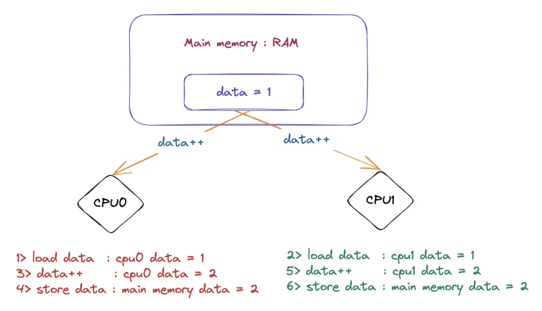 比如在下面的圖當中,兩個線程分別在 CPU0 和 CPU1 執行 data++ 語句,如果目前主存當中的 data = 1 ,然後按照圖中的順序去執行,那麼主存當中的 data 的最終值等於 2 ,但是這並不是我們想要的結果,因為有兩次加法操作我們希望最終在內存當中的 data 的值等於 3 ,那麼有什麼方法能夠保證一個線程在執行 data++ 操作的時候下面的三步操作是原子的嘛(不可以分割):