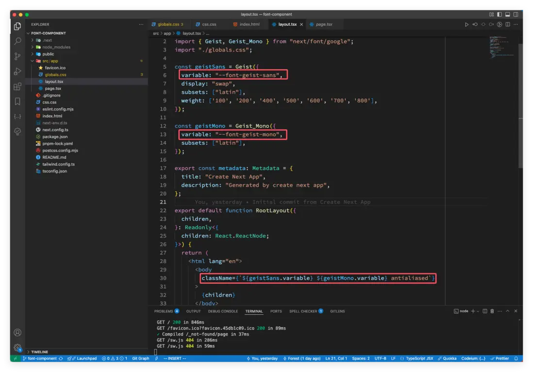 variable聲明 CSS 變量import { Geist, Geist_Mono } from 'next/font/google' import './globals.css' // 引入 css const geistSans = Geist({ variable: "--font-geist-sans", display: "swap", subsets: ["latin"], weight: ['100', '200', '400', '500', '600', '700', '800'], }); const geistMono = Geist_Mono({ variable: "--font-geist-mono", subsets: ["latin"], }); export default function RootLayout({ children }: Readonly<{ children: React.ReactNode }) { return ( <html lang="en" className={`${geistSans.variable} ${geistMono.variable}`}> <body> <h1>My App</h1> <div>{children}</div> </body> </html> ) } -