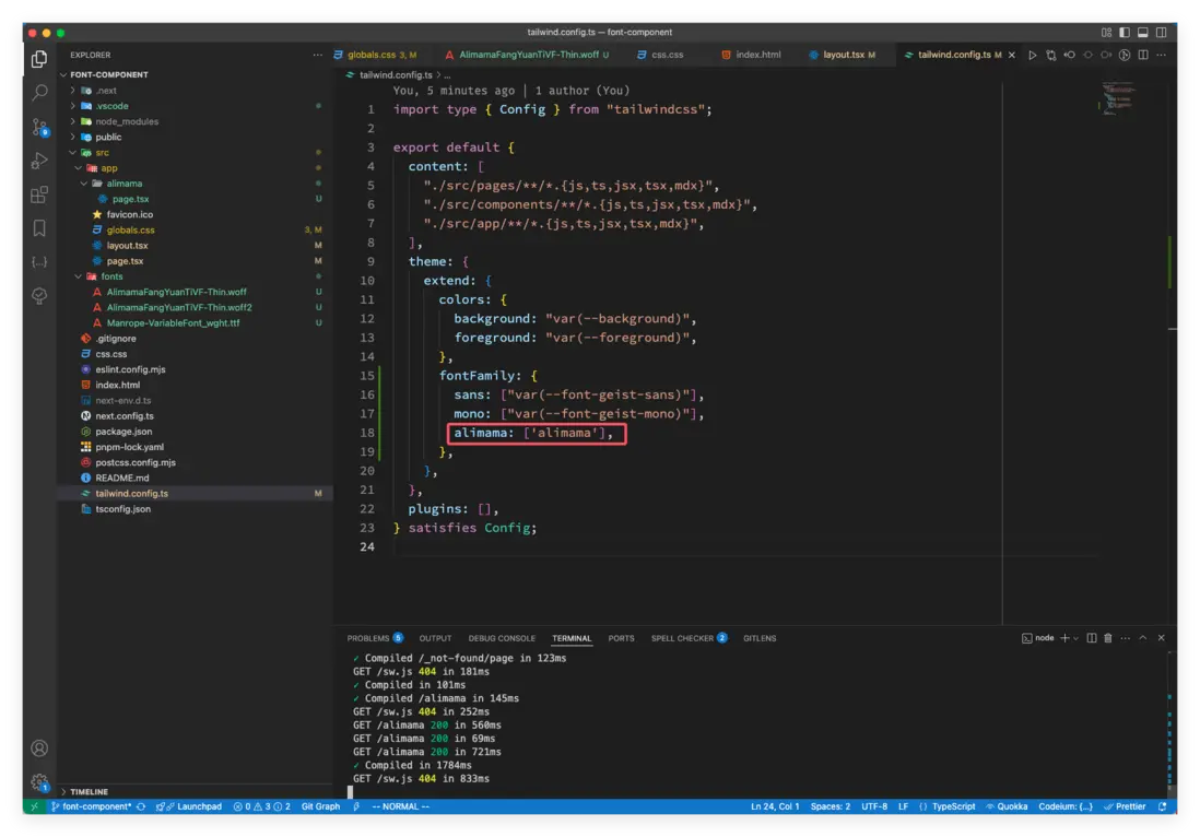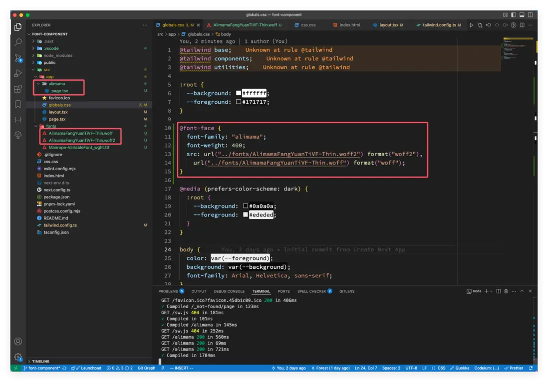 下載字體後,將字體放入項目中並在 globals.css 中引入,然後創建 alimama/page.tsx 文件。 如下圖: