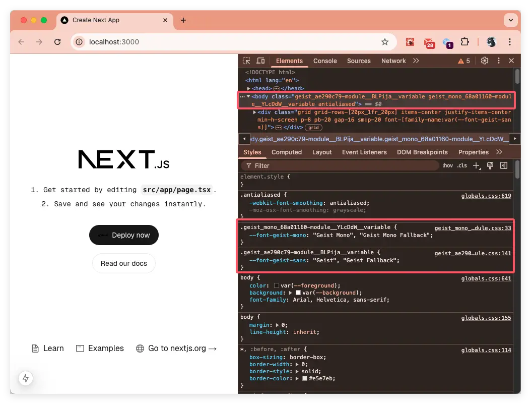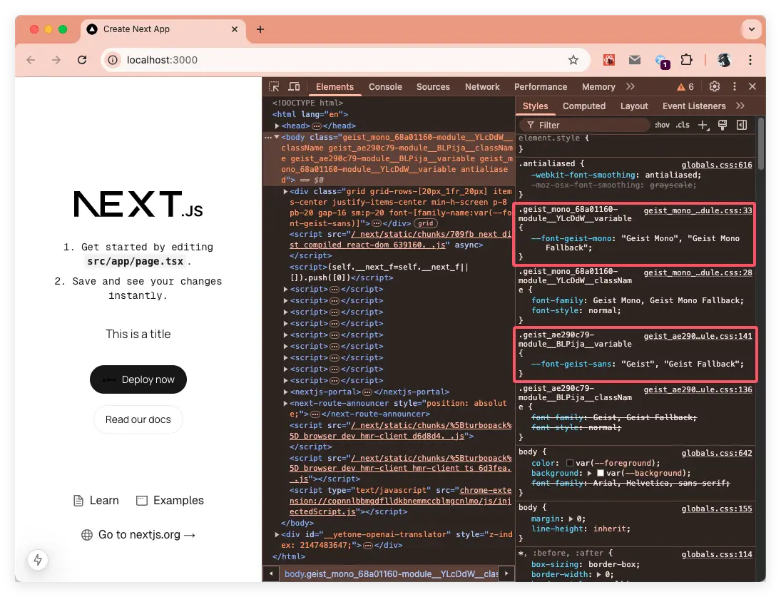 import { Geist, Geist_Mono } from 'next/font/google' const geistSans = Geist({ variable: "--font-geist-sans", display: "swap", subsets: ["latin"], weight: ['100', '200', '400', '500', '600', '700', '800'], }); const geistMono = Geist_Mono({ variable: "--font-geist-mono", subsets: ["latin"], }); export default function RootLayout({ children }: Readonly<{ children: React.ReactNode }) { return ( <html lang="en" className={`${geistSans.variable} ${geistMono.variable}`}> <body> <h1>My App</h1> <div>{children}</div> </body> </html> ) }在瀏覽器渲染後的效果如下: