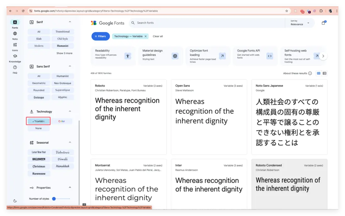 在 Google Fonts 可以查看到很多可變字體,篩選條件也很簡單(選中左側的 Variable),如下圖: