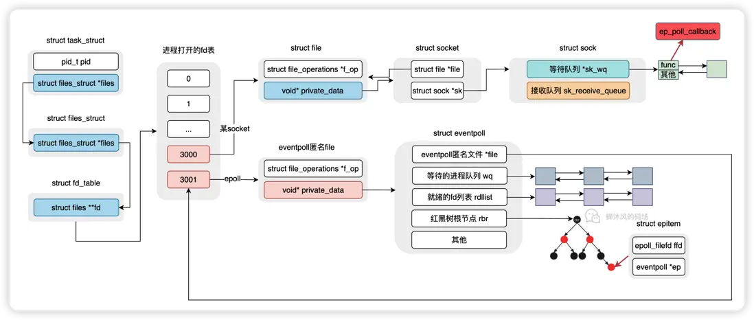 還有一個小問題,不知道朋友們注意到了沒有,我沒提保存當前用户進程信息這回事兒。這也是epoll更加高效的一個原因,現在socket已經完全託管給epoll了,因此我們不能在一個socket準備就緒的時候就立刻去喚醒進程,喚醒的時機得交給epoll,這就是為什麼eventpoll對象還有一個隊列的原因,裏邊存放的就是阻塞在epoll上的進程。