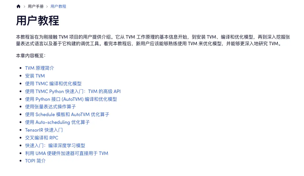 中文文檔在 TVM 官網英文文檔的架構基礎上,做了更符合國人閲讀習慣的調整,從安裝 TVM 到使用開發,提供了一系列可供參考的實用文檔。