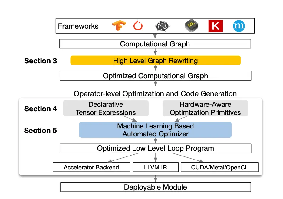 這是一個開源的模型編譯框架,全稱 Tensor Virtual Machine,意為張量虛擬機,旨在將機器學習算法自動編譯成可供下層硬件執行的機器語言,從而利用多種類型的算力。