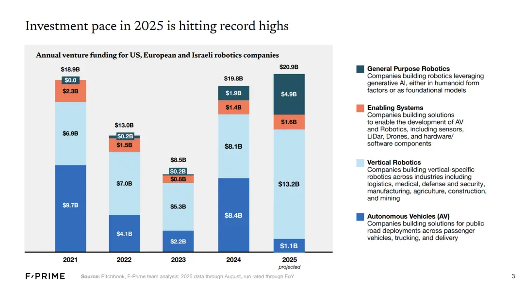 路透社曾在報道中援引 F-Prime Capital 的報告指出「2024 年全球機器人領域的投資額將飆升至 186 億美元,比上一年增長 116%」,根據 F-Prime 在 2025 年下半年發佈的最新動態數據進一步顯示,這一增長勢頭並未放緩,全球機器人投資額預計在 2025 年有望突破 209 億美元大關,刷新歷史最高紀錄。