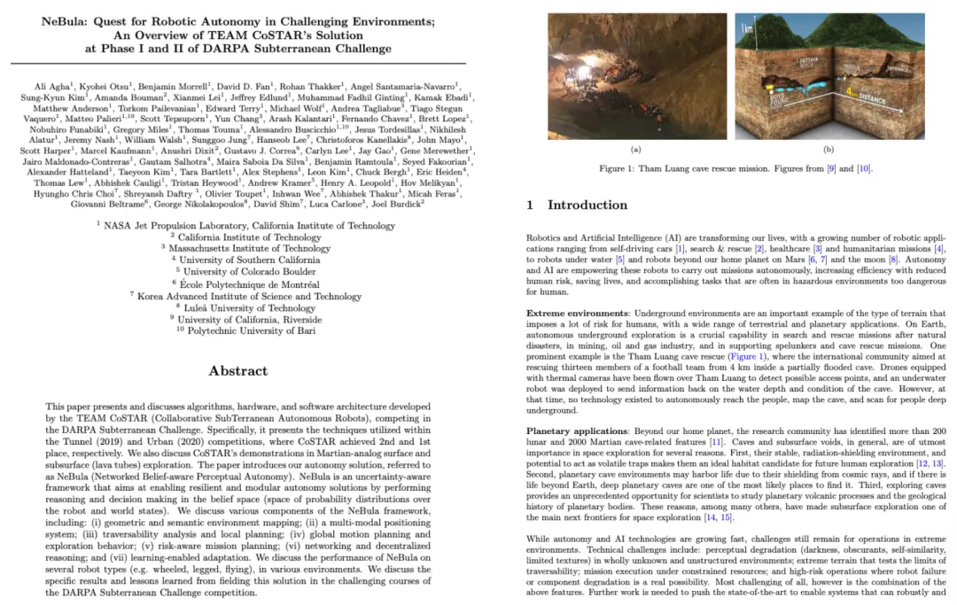 例如,Agha 與團隊成員在 Journal of Field Robotics 上發表了題為「NeBula: Team CoSTAR’s robotic autonomy solution that won phase II of DARPA Subterranean Challenge」的論文,系統介紹了用於複雜、未知環境下機器人的自主決策框架 NeBula,該框架能夠在面對不完整感知和任務不確定性時,結合多模態信息進行風險感知、環境映射與路徑規劃。