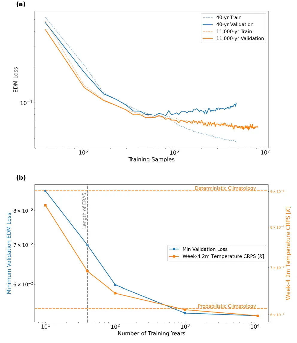 首先,該研究驗證了核心假設——增加合成訓練數據量能顯著提升模型預報能力。如下圖所示,該研究使用僅 40 年模擬數據訓練的模型很快出現過擬合,而基於約 1.1 萬年合成數據訓練的模型(簡稱 DLESyM10K)則表現出穩定的學習曲線。更重要的是,數據量的增長直接轉化為預報技能的提升:在 4 周氣温預報中,CRPS 評分降低了 14% 。這首次證明,利用自迴歸模型生成大規模合成數據,可有效構建更強大的長期預報模型。
